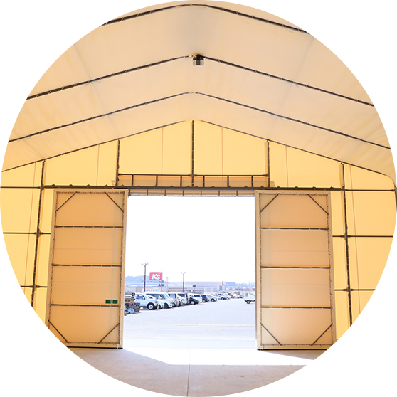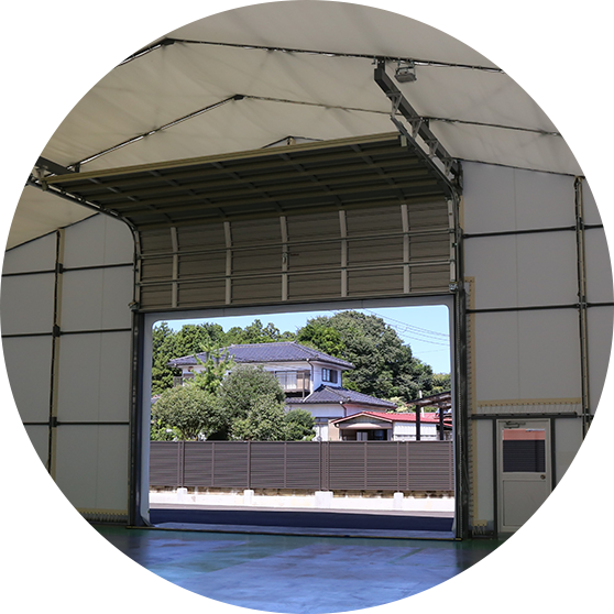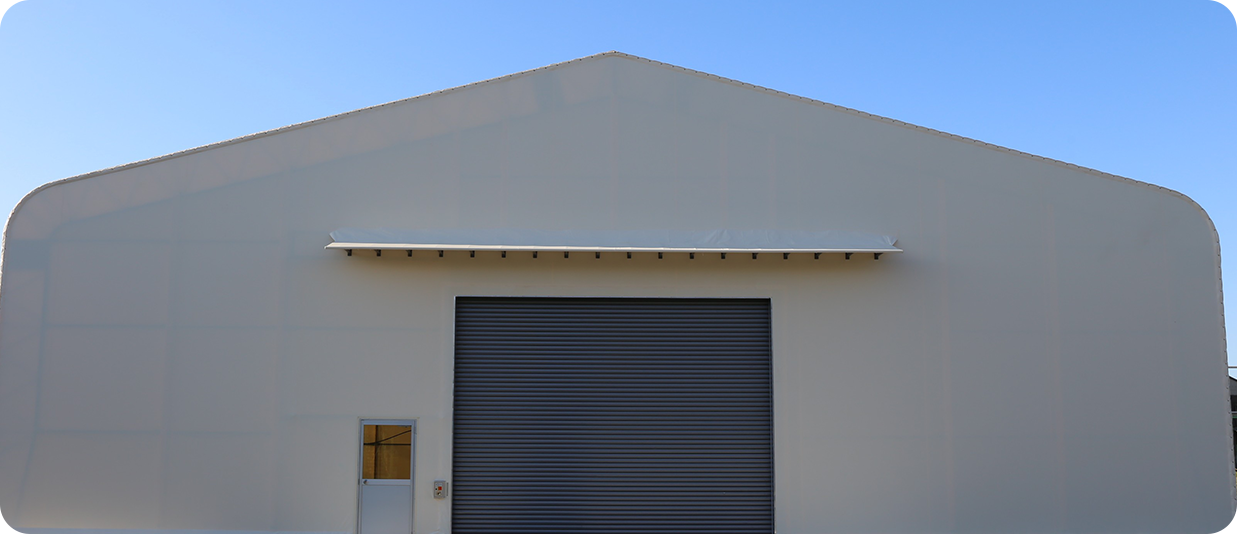 当社の那須工場の製品倉庫です。オーバースライドドアを採用し、手動でも大型開口を取ることができました。 那須工場には工場テントとテント倉庫を設置しているため、初めて工場テント・テント倉庫の建築を計画している方などの見学も受け付けています。